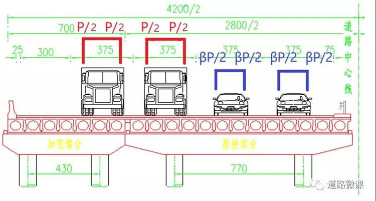 1.按車(chē)輛類(lèi)型在拼寬橋梁施行分車(chē)道交通組織管理,降低拼寬橋中既有橋梁的荷載效應(yīng)。既有橋梁部分主要承擔(dān)輕型車(chē)荷載,新建橋梁部分主要承擔(dān)重型車(chē)荷載。